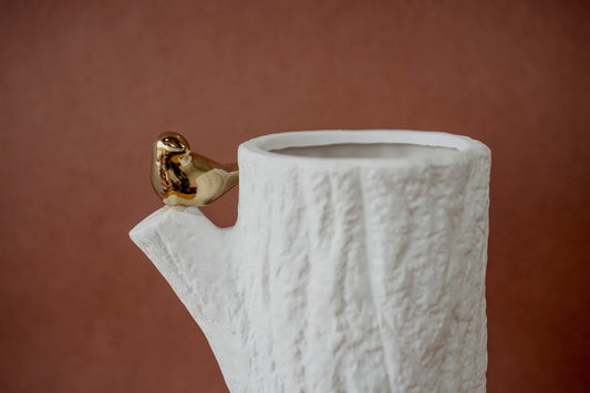White Flower Vase Golden Sparrow Decor Showpiece